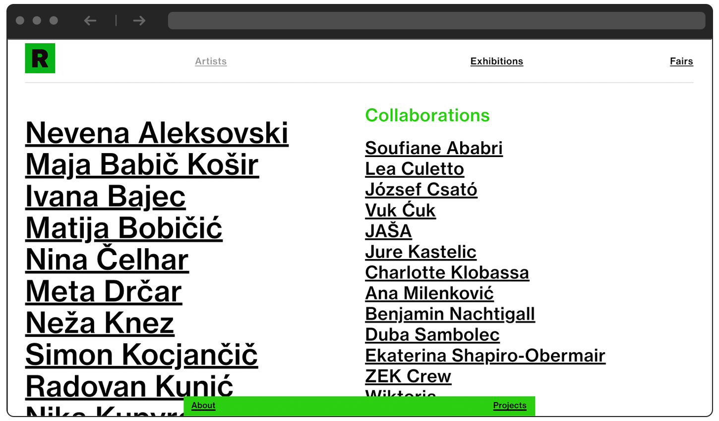 Website design for a contemporary art gallery that represents a diverse roster of internationally artists while striving to promote the emerging generations.